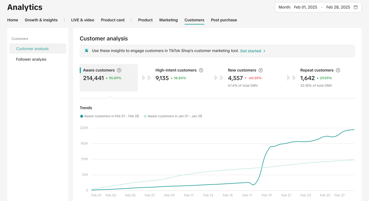 The only available insight is in the Customer Analysis tab, which gives you weekly or monthly breakdowns of new vs returning customers â but doesnât attribute them to specific creators, videos, or campaigns.