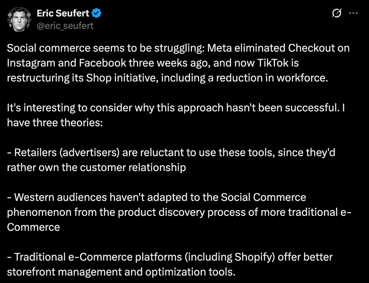 Everything else — “it doesn’t work for our brand,” “consumers aren’t buying from social,” “we haven’t cracked it” — are symptoms of execution, not structural failure.