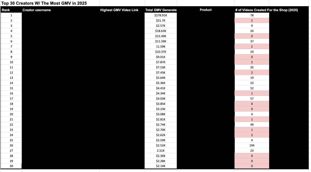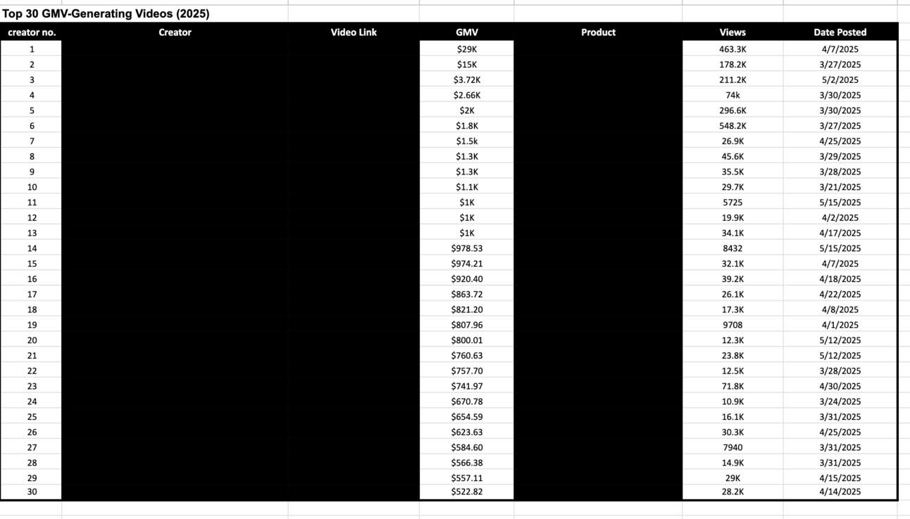 And last week, we ran a deep dive affiliate audit on the top 30 GMV-generating videos for one of our accounts. The goal was to better understand: